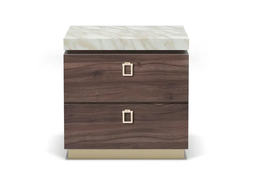 The Wood Veneer Bedside Table features smooth curves and sharp angles that create a striking visual impact. The interplay between the marble top and wood veneer structure adds depth and dimension, while the gold metal base enhances the overall aesthetic. Attention to detail is evident in the designer handles, which add a touch of sophistication and functionality to the piece.