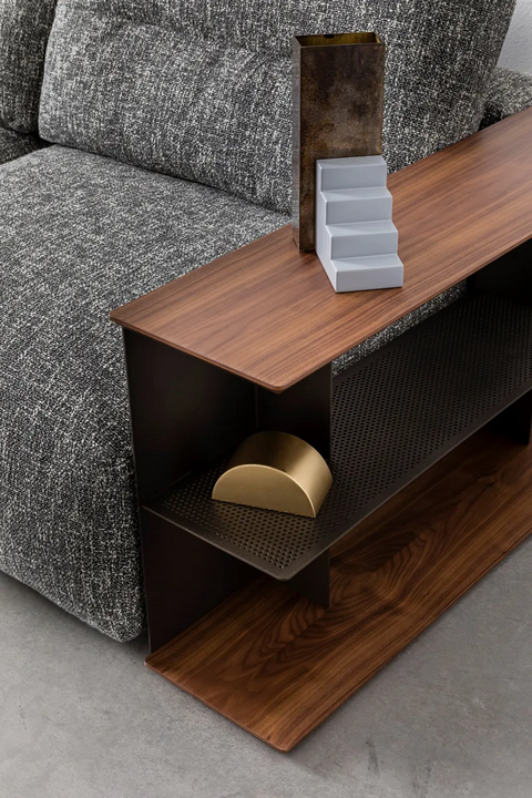 The MY TAOS sofa showcases thoughtful design details, such as cylindrical support cushions and fold-out side tables, enhancing both functionality and aesthetics. The rounded overall form softens the visual impact, making it a perfect centerpiece for living rooms. Decorative elements are subtle yet impactful, contributing to a sophisticated ambiance that draws the eye.