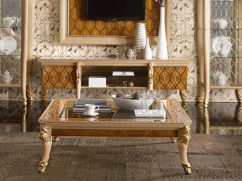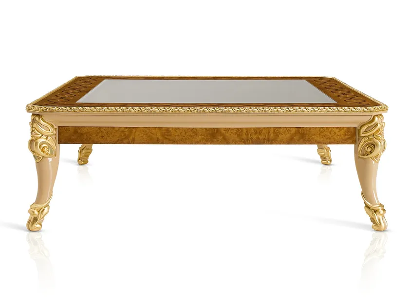 This coffee table is made from a combination of environmentally friendly materials, including MDF, solid wood, and glass. The main structure is crafted from plywood and veneered MDF, ensuring durability and stability. The intricate carvings and frames are constructed from solid wood, adding a touch of elegance. The finish features a shiny swirled lacquer that not only enhances the visual appeal but also provides a protective layer, ensuring long-lasting beauty and ease of maintenance.