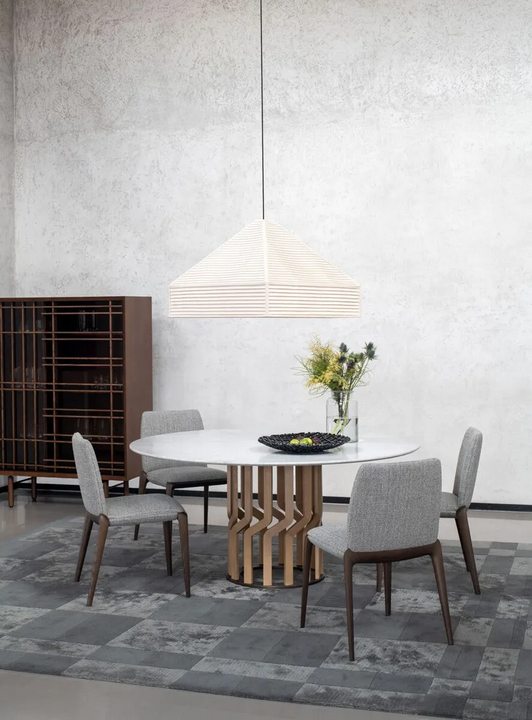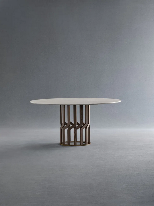 The Round Ash Table boasts a captivating design characterized by its fluid forms and intricate detailing. The 14 solid wood elements of the base create a visually striking silhouette that draws the eye. The smooth, circular tabletop serves as an inviting surface for dining, while the elegant marble finish adds a touch of luxury. Every aspect of this table has been thoughtfully designed to create a harmonious and sophisticated look.