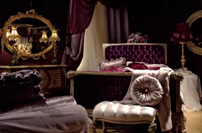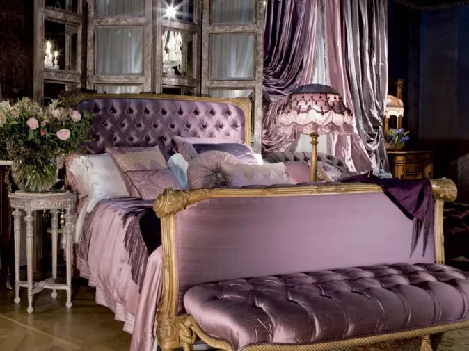 Double bed with high upholstered headboard, without footboard. Decorated with carving. Other finish options and upholstery.