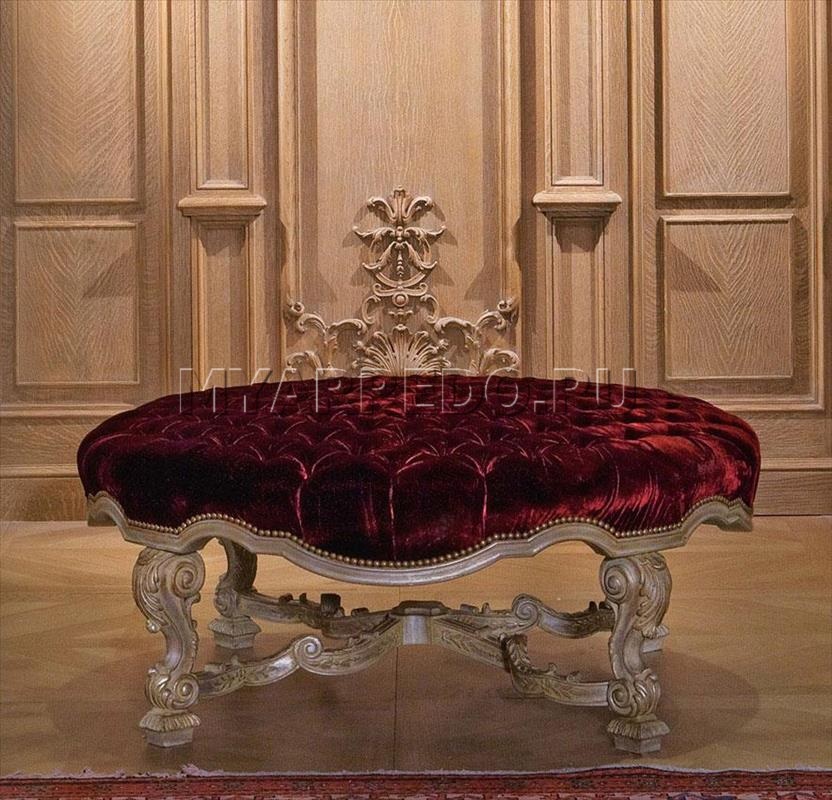 Pouf round. The filling is polyurethane. Dekorieren carved elements. There may be other options upholstery and trim.