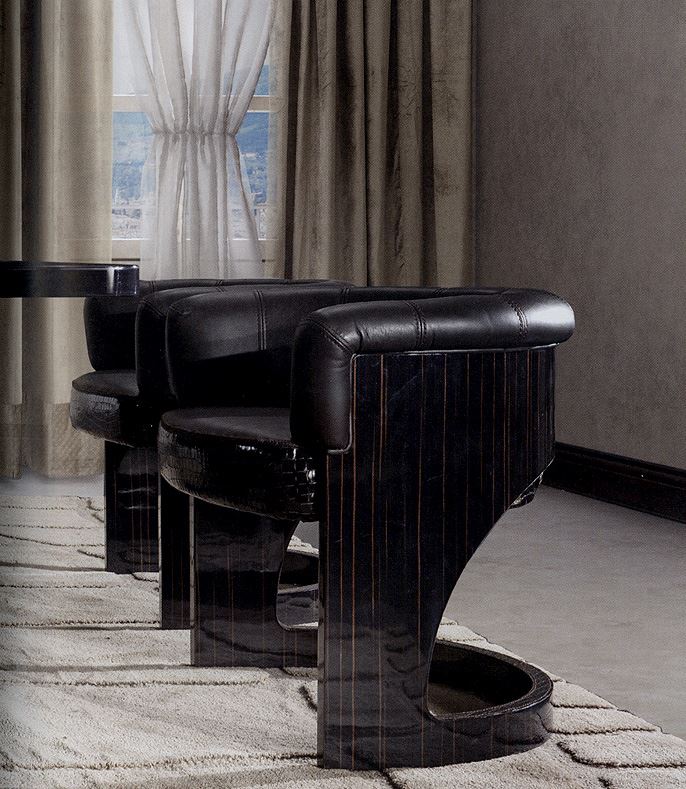 STU with a rounded back, distributed on one level with backrest and leather upholstered presented Italian furniture company Formitalia in the collection of the Luxury group. Decorated in a contemporary style is upholstered in naturally leather-black color.&Design chair made of veneer finishing in the "Madagascar tree". The design with the game over variations of a cylindrical form and decorated with metal decorative details. Chelsea can be made in other color options upholstery leather