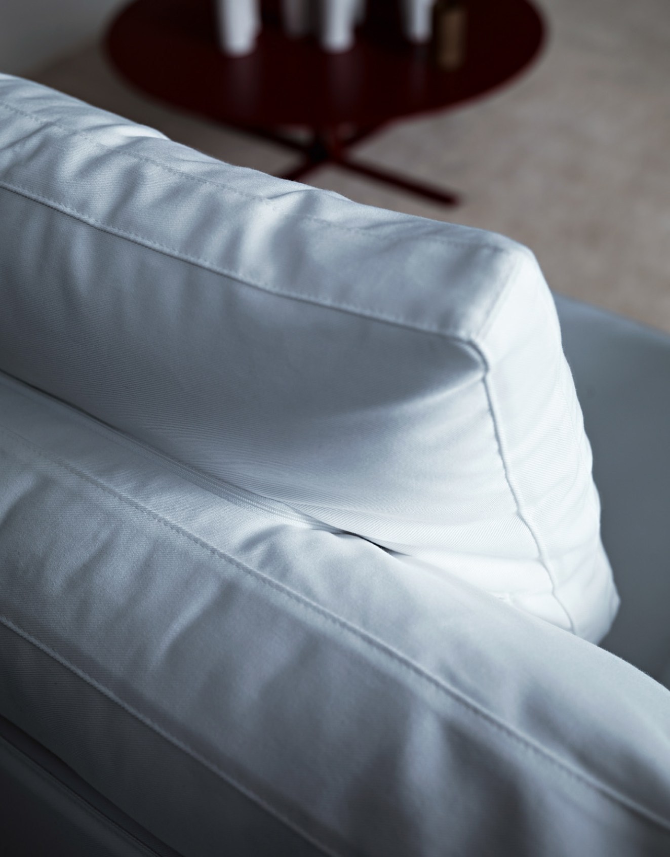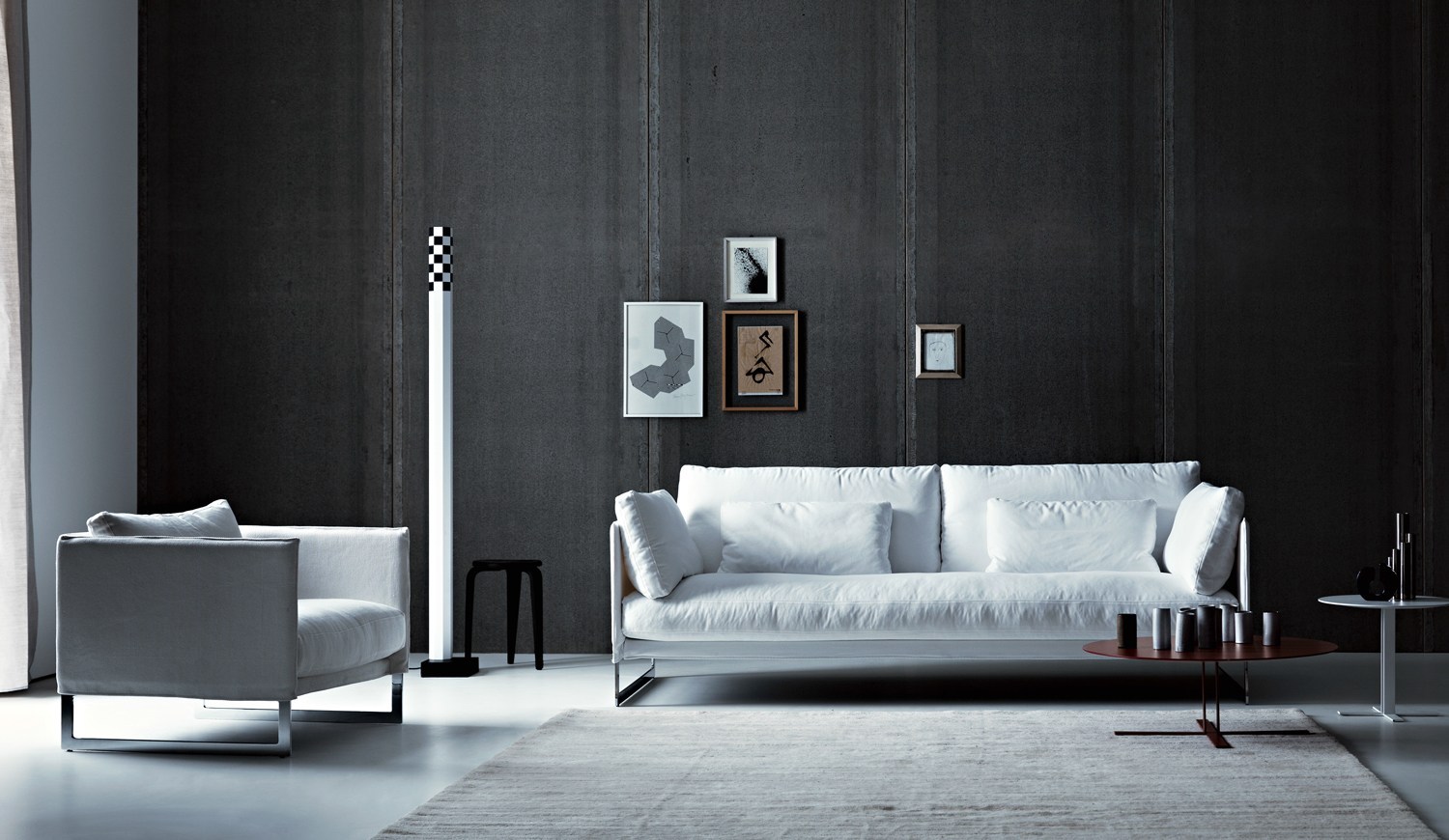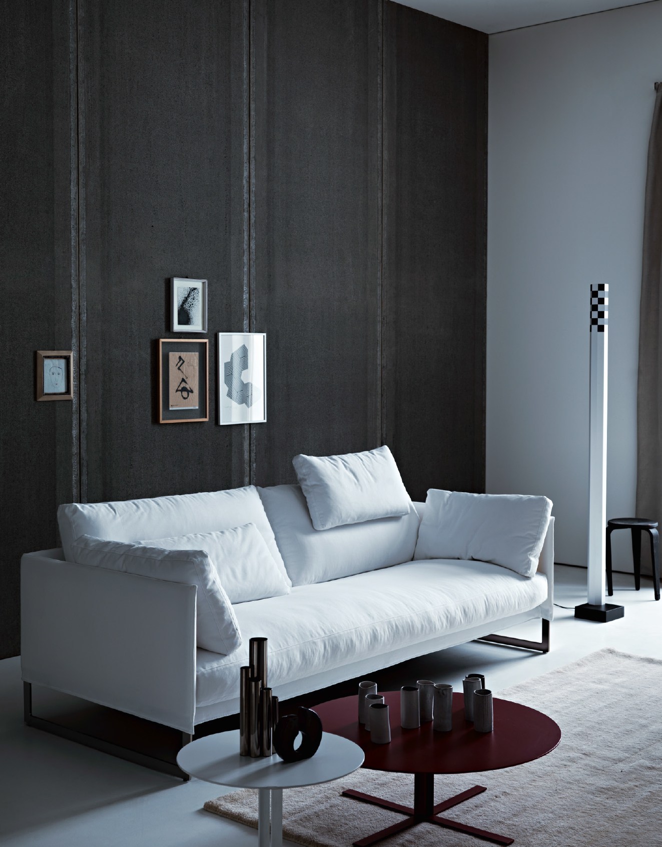 Sofa Livingstone. Structure: black painted steel; the seat is spring-loaded with elastic straps reinforced with polypropylene; steel armrests padded with polyurethane foam and covered with white velveteen padded with polyurethane foam; the back is made of multi-layered wood covered with Velfodera with a pressed polyester lining. Legs: Specially shaped steel, high-gloss chrome or black nickel finish. Padding: Back and arm cushions are stuffed with goose down, divided into sections and covered with white 100% cotton fabric. The seat cushions are made of polyurethane foam core and memory foam, covered with a polyester fiber welfodder. The feathers in the back cushions are mixed with polyester fiber. Upholstery available in leather or fabric.